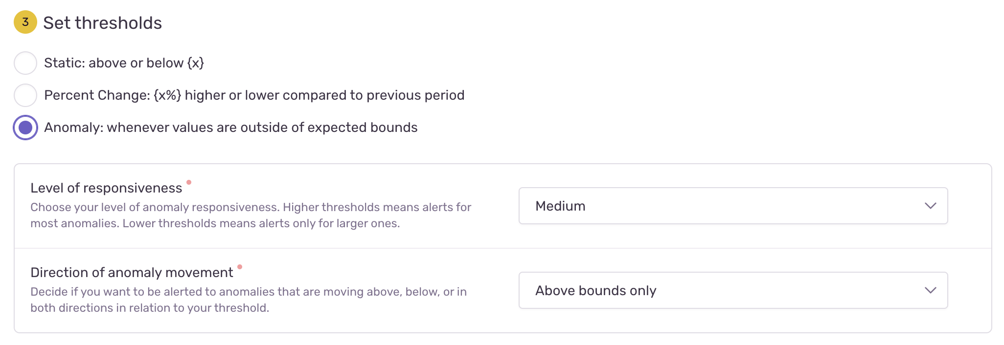 There are three options for alert responsiveness: low, medium, and high. If you choose low responsiveness, then your alert will fire less frequently but with higher confidence. If you choose high responsiveness, then your alert will fire more frequently with a greater chance of false positives. Our recommendation is to start with medium responsiveness, our default, and adjust the responsiveness based on the results you see.