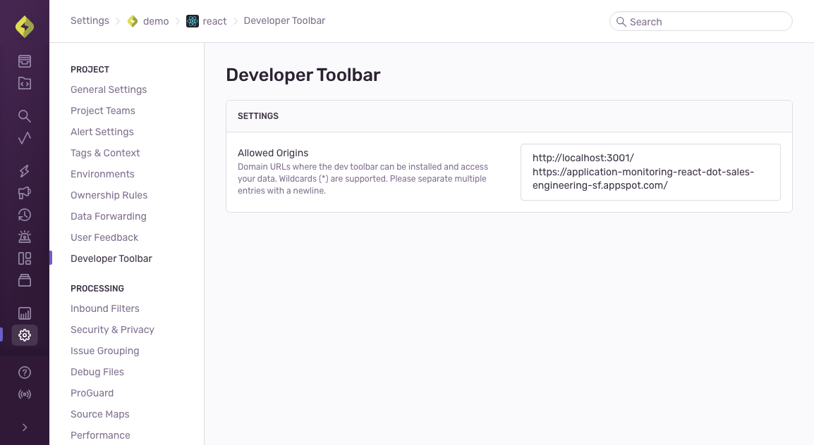 3. Edit Project Settings in Sentry so the Toolbar is allowed to connect from your dev, staging, and production domains. Sentry's Dev Toolbar Settings Page
