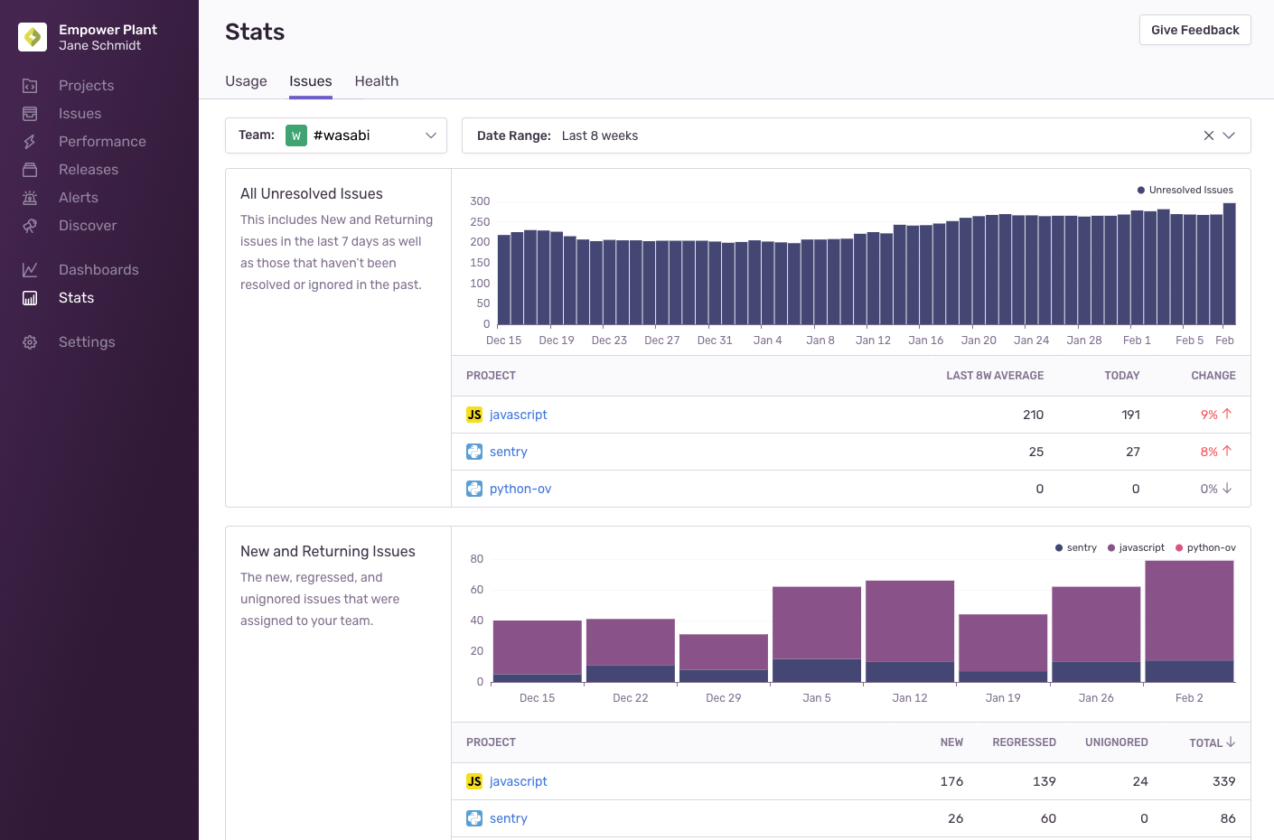 The "All Unresolved Issues" chart and table show new and returning issues per project in the last seven days, as well as those that haven’t been resolved or archived in the past.